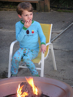 Brendan has been talking about camping since winter. He saw a cartoon where some kids went camping and since then he had been saying that he wanted to go. A few people suggested that he "camp" in the backyard to see if he likes it before really goes"camping". So we borrowed a tent and Sean bought some sleeping bags. We decided to try out our new firepit and toast marshmellows too. At dusk, Brendan had fun catching fireflies. Love his "buggy" PJs? Autumn also enjoyed the fun. She stayed out all night "protecting" her boys from the elements. What a good puppy.